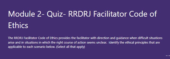 Module 2B-(Interviewing skills), Module 3 (The Interview) and Module 4 (The Conference) will be done in-person so that you have the opportunity to practice and develop skills in both interviewing and conference facilitation. Once you have been accepted into the RRDRJ Facilitator role, the Program Coordinator will let you know the date, time and location for these sessions.